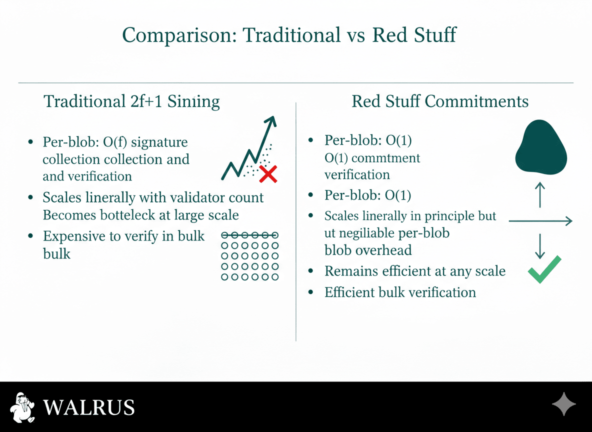 Aqui é onde fica elegante: verificar um compromisso do Red Stuff é O(1) por blob, não O(f) como assinaturas tradicionais. Você não verifica f assinaturas. Você verifica um compromisso.