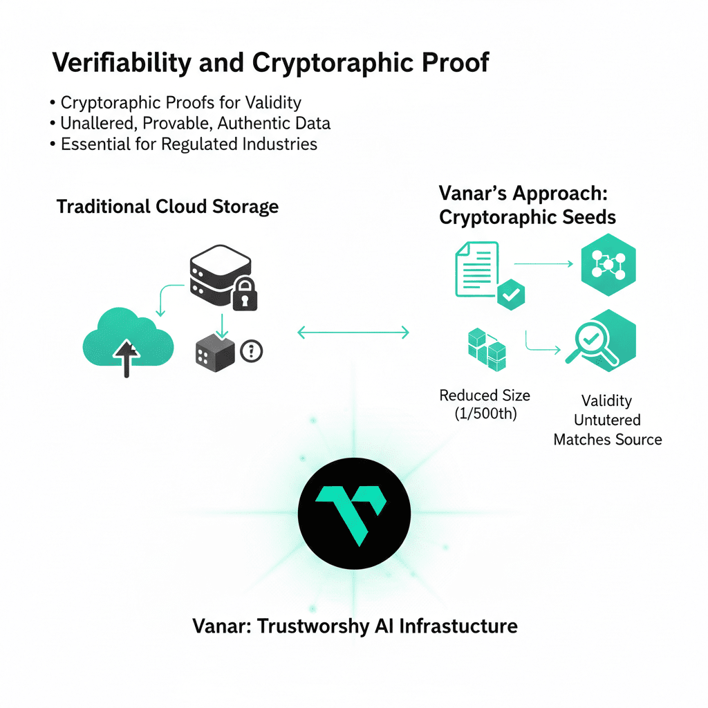 O que distingue a abordagem da Vanar de simplesmente fazer upload de documentos para armazenamento em nuvem é a verificação criptográfica. Cada Semente é respaldada por "Provas Criptográficas que verificam que o que você recupera é válido, provável e recuperável—mesmo a 1/500 do tamanho." Isso significa que você pode provar que uma Semente não foi alterada, que ela corresponde à fonte original e que é autêntica. Para indústrias regulamentadas e aplicações de alto risco, isso é essencial.