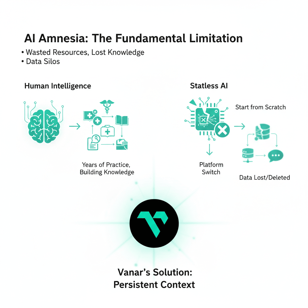 Esse fenômeno—o que a Vanar chama de amnésia da IA—não é um pequeno inconveniente. É uma limitação arquitetônica fundamental que impede a inteligência artificial de alcançar seu pleno potencial. Cada conversa que começa do zero desperdiça recursos computacionais na reexplicação de contexto. Cada troca de plataforma apaga o conhecimento institucional. Cada insight brilhante corre o risco de ser perdido para sempre porque vive em um banco de dados centralizado controlado por uma empresa que pode ser fechada, mudar os termos de serviço ou deletar seus dados.