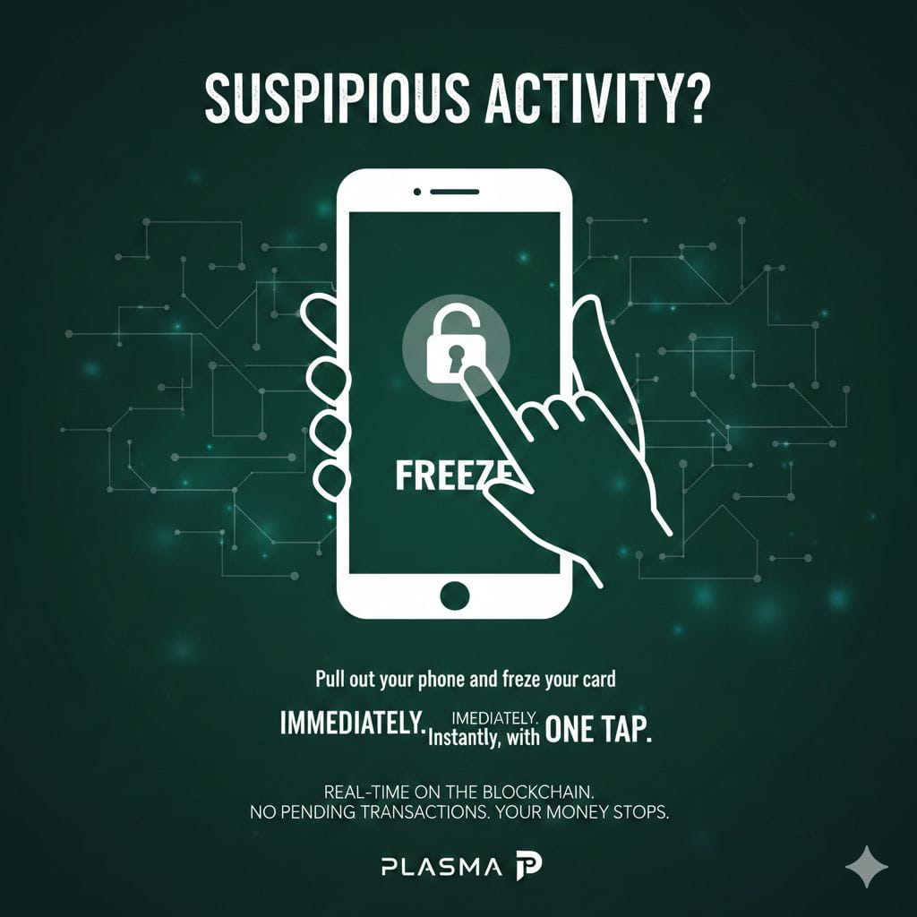 Isso está explodindo agora de maneiras que os bancos tradicionais não conseguem igualar. Todos já sentiram aquela sensação de afundar—uma transação suspeita aparece na sua conta, e você fica preso em espera com o atendimento ao cliente esperando que eles façam algo a respeito antes que mais danos ocorram. Plasma One muda completamente o jogo com controles instantâneos que colocam você no comando. Congele seu cartão em segundos. Receba alertas em tempo real antes que algo aconteça. Proteja seu dinheiro nos seus termos, não na linha do tempo de algum banco.