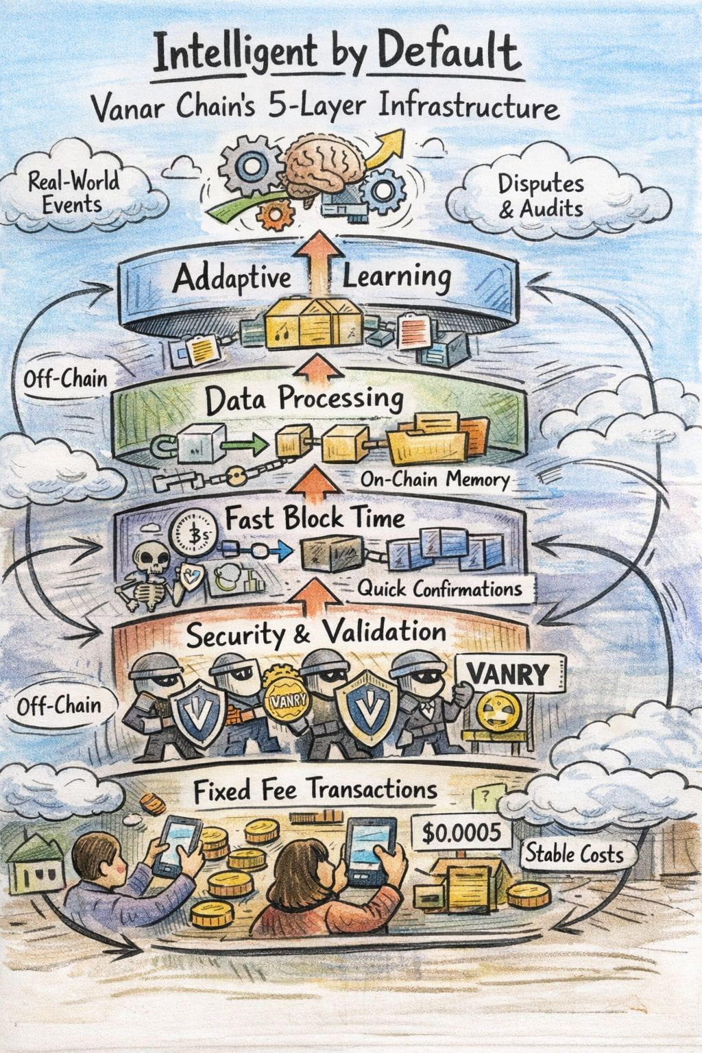 In the end, Vanar Chain’s five-layer story is less about layering “features” and more about layering responsibility. It’s an attempt to build a stack where applications can improve over time without turning users into collateral damage when conditions change. The quiet ambition is that learning doesn’t mean improvising—it means becoming more dependable because the record is durable, the costs are predictable, the incentives are aligned, and the chain stays responsive when people need it most. VANRY’s capped supply design, the genesis and long-term issuance plan, the fixed-fee target around $0.0005, the three-second block-time goal, and the compression claims about shrinking large files into something that can live on-chain are all, in their own way, commitments to boring reliability.