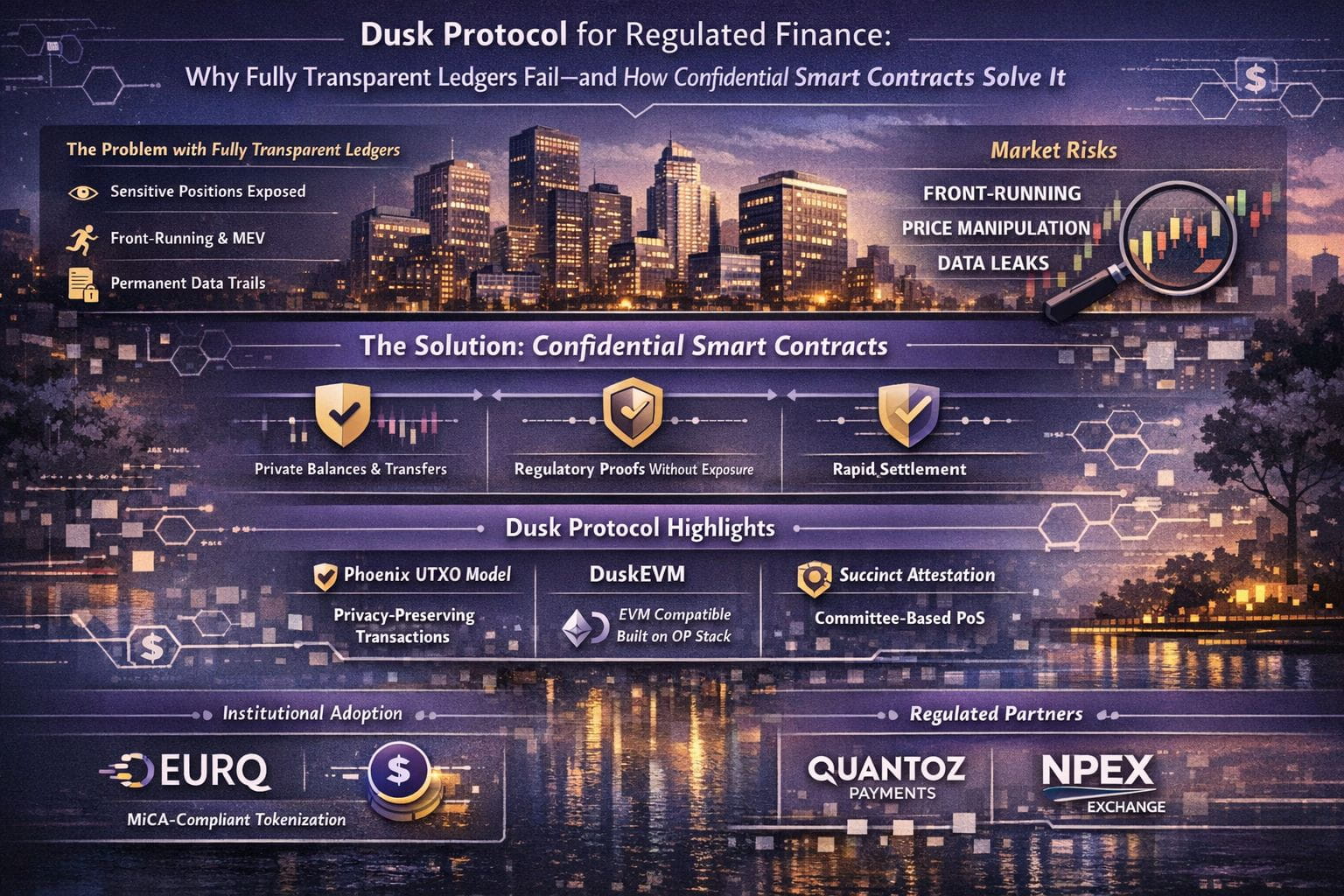 @Dusk A primeira vez que alguém diz: “basta colocá-lo em uma blockchain pública” para um mercado regulado, pode parecer quase justo—como se a transparência fosse um atalho para a confiança. Todo mundo vê tudo, então a fraude se torna mais difícil e a confiança fica mais barata. Em um quadro branco, é organizado e confortante. Em um mercado ao vivo, fica bagunçado rapidamente. O comércio é baseado em posições, contrapartes, intenções e tempo—detalhes que são confidenciais por razões que não têm nada a ver com esconder irregularidades. Quando esses detalhes vazam, os mercados não se tornam mais limpos; eles se tornam mais fáceis de manipular, mais difíceis de cotar e mais frágeis quando a pressão chega.
