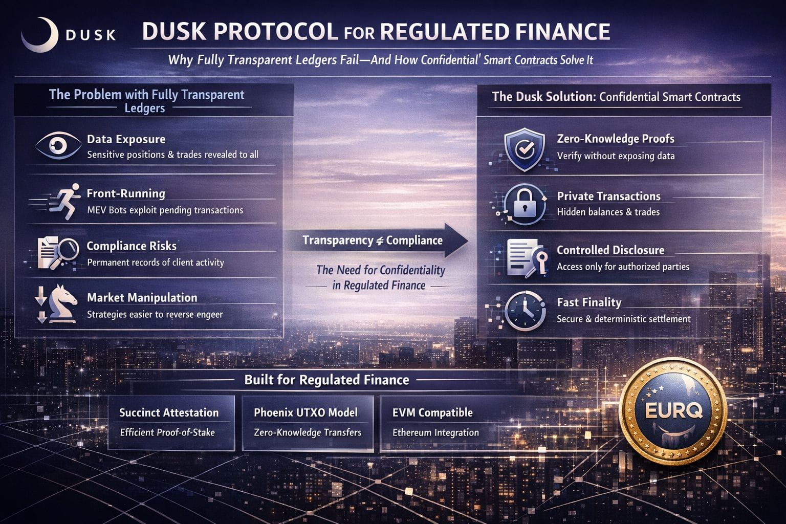 Dusk é construído para essa interseção. Sua documentação o descreve como a blockchain de privacidade para finanças reguladas, visando permitir que instituições atendam aos requisitos regulatórios on-chain enquanto oferecem aos usuários saldos e transferências confidenciais, e fornecem aos desenvolvedores ferramentas familiares mais primitivas nativas de privacidade e conformidade. A mudança mental é simples, mas importante: a privacidade não é o oposto da supervisão. A estrutura de “Conformidade de Conhecimento Zero” do Dusk se inclina para a divulgação seletiva—os participantes podem provar que atendem aos requisitos regulatórios sem expor detalhes pessoais ou transacionais, enquanto ainda possibilitam auditorias quando realmente necessárias.