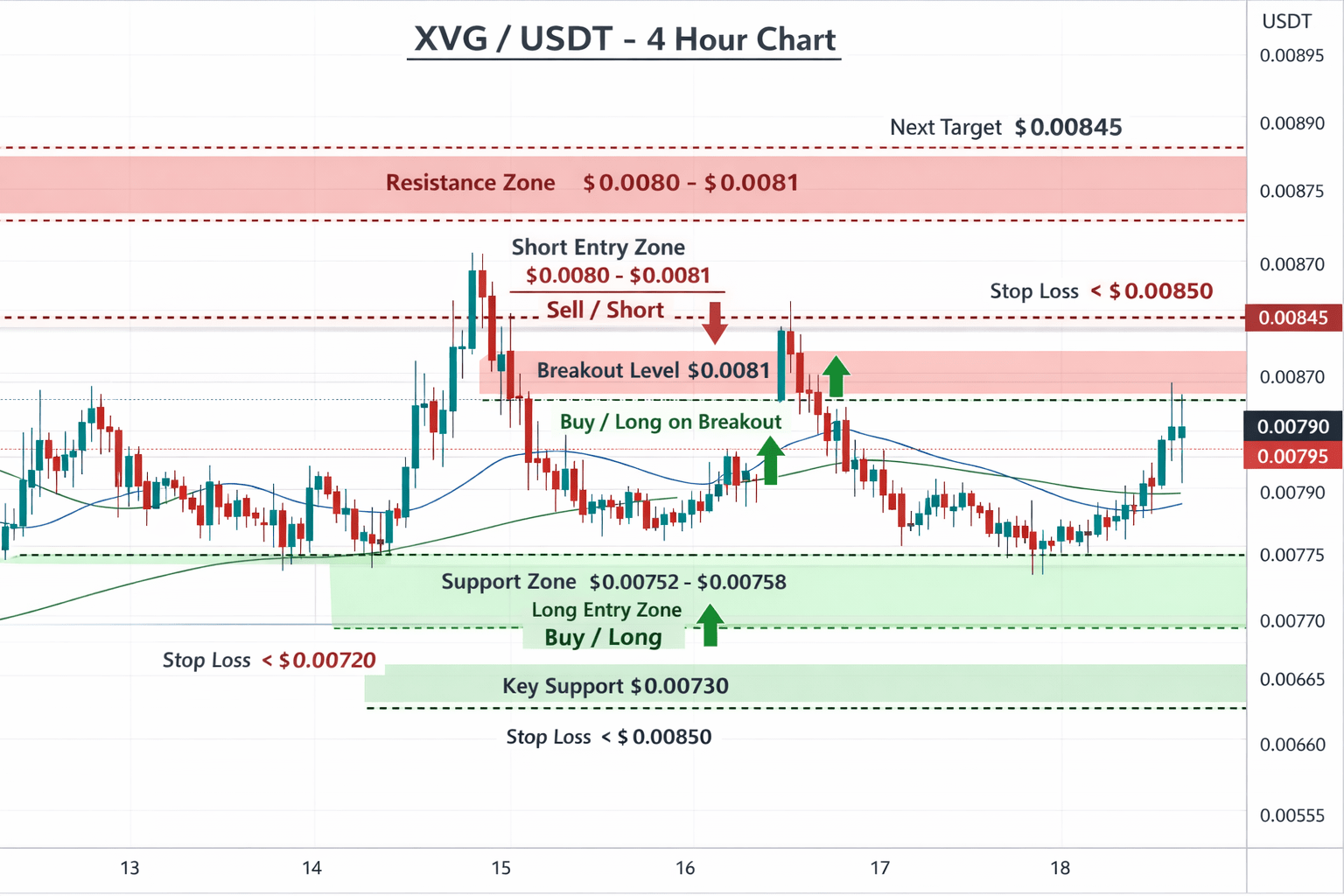 rejeição na resistência e quebra abaixo de $0.0075–$0.0073 → queda em direção a $0.0070. �$XVG
