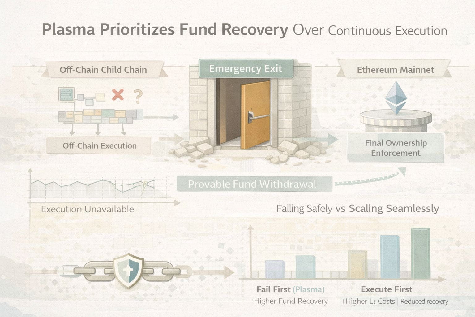 @Plasma nunca foi criado para garantir a execução contínua. Sua promessa central é mais limitada e conservadora: caso sistemas fora da cadeia fiquem inválidos, o usuário ainda deve ser capaz de recuperar seu dinheiro no Ethereum. Esta alternativa de design prioriza a recuperação de fundos antes da disponibilidade, throughput ou continuidade da execução. O Plasma reconhece que ambientes fora da cadeia são fracos e constrói suas garantias sobre o que pode dar errado, e não sobre o que pode dar certo.