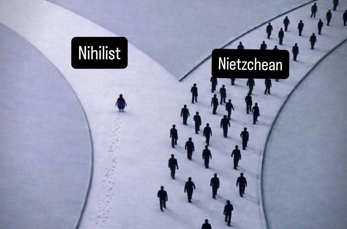 O Pinguim Nihilista reflete a descrição associada à filmagem original narrada por Werner Herzog, enquanto o Pinguim Nietzcheano na verdade não corresponde ao nome real do pinguim nomeado por Werner.Alinhamento mais próximo com a narrativa.