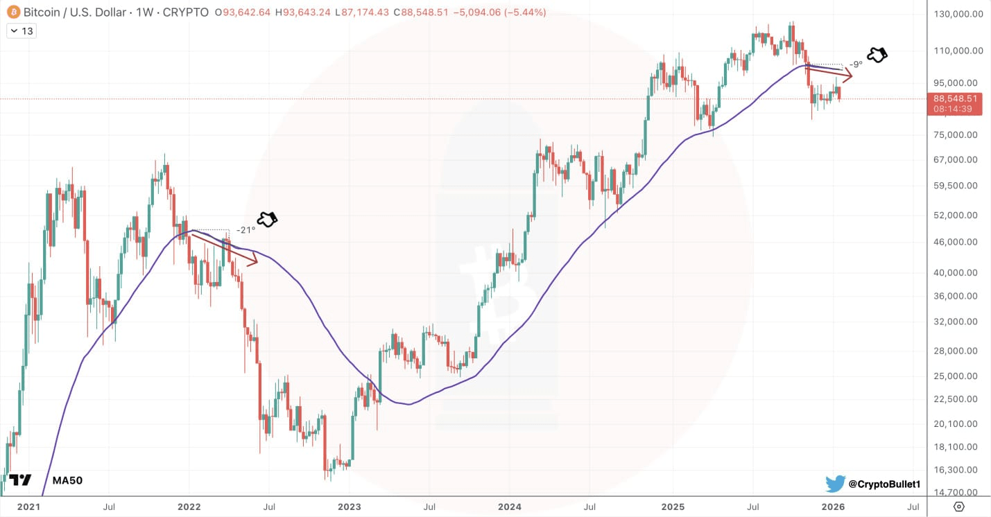 O Bitcoin está fechando sua 11ª vela semanal consecutiva abaixo da média móvel de 50 semanas — e pela primeira vez desde fevereiro de 2022, essa média móvel está inclinada para baixo 📉