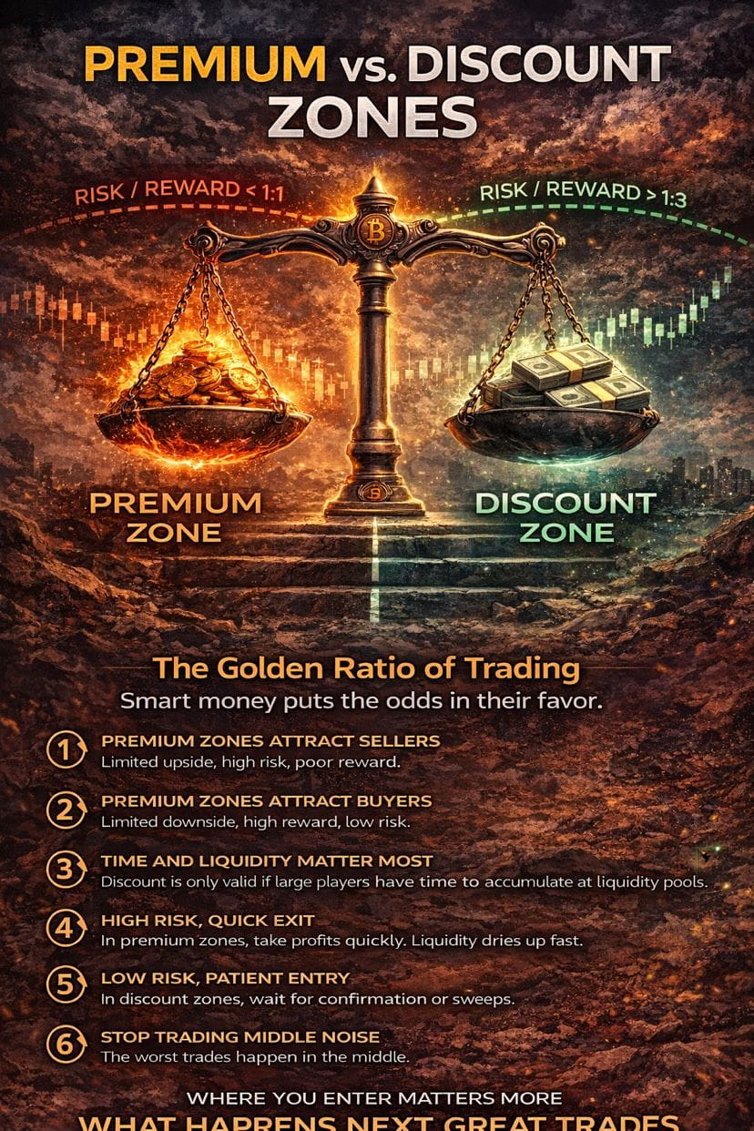 Smart traders focus on where to trade.The market does not reward random entries. It rewards entries taken at favorable prices, where risk is low and reward is high. This is where the concept of Premium and Discount Zones becomes powerful.