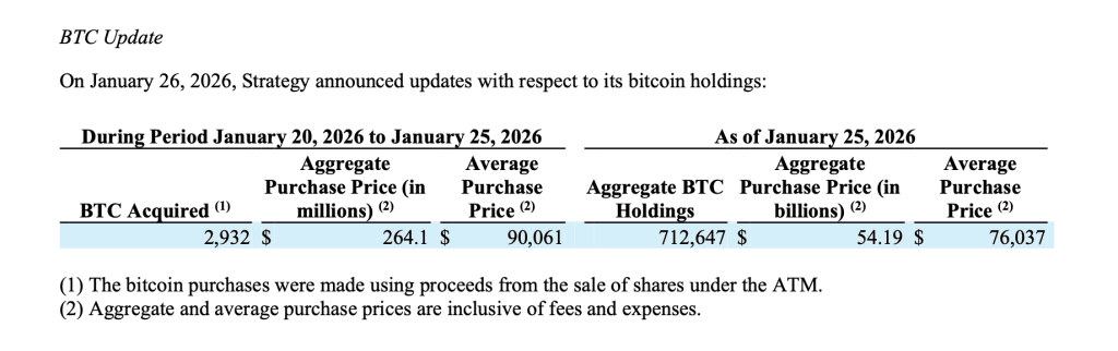 A estratégia adquiriu 2.932 BTC por aproximadamente $264,1 milhões a ~$90.061 por bitcoin. Em 25/01/2026, mantemos 712.647 $BTC adquiridos por aproximadamente $54,19 bilhões a ~$76.037 por bitcoin. $MSTR $STRC https://t.co/RooLfEvniX