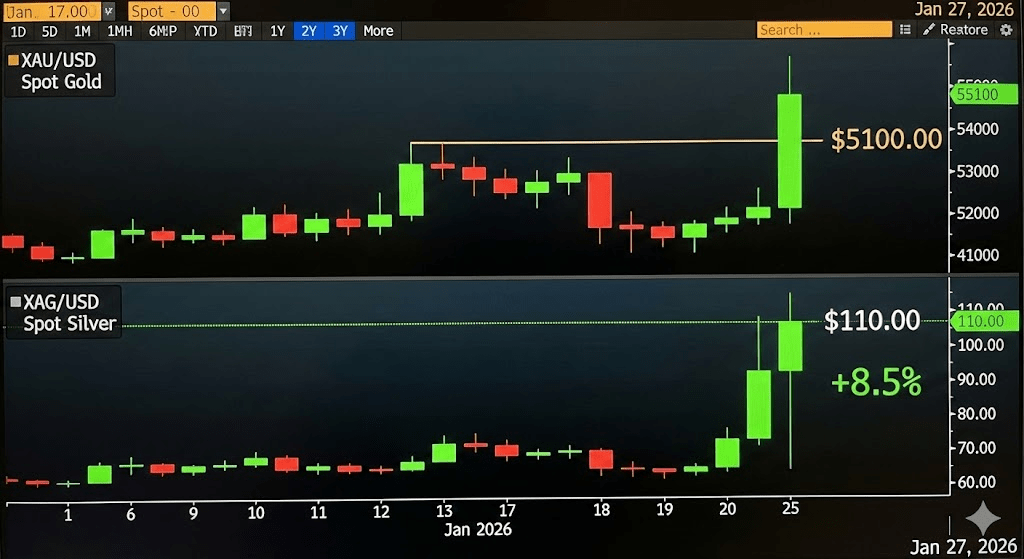 Isso não é apenas uma quebra de números, mas mais como uma zombaria silenciosa. Enquanto os elites de Wall Street ainda estão ansiosos pelos relatórios de lucros das ações de tecnologia desta semana e pela reunião de política monetária do Federal Reserve, o capital inteligente já sentiu o cheiro de perigo e fez a escolha mais honesta. A prata, então, disparou como um cavalo selvagem, subindo para 110 dólares em um único fôlego, esse aumento violento de 8,5% em um dia me fez ver a sombra do mercado em alta das criptomoedas alguns anos atrás.