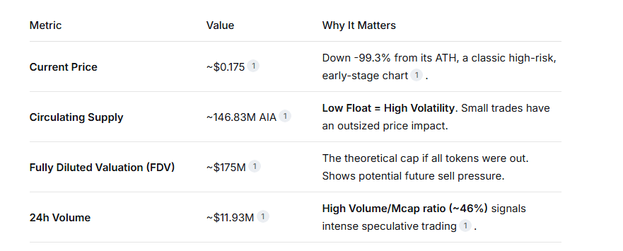 Primeiro, entenda o combustível: apenas ~130M-147M tokens AIA estão em circulação de um total de 1 bilhão. Isso é um token de baixo float e alta FDV. Em termos simples, a oferta limitada disponível encontra uma diluição futura massiva. Isso faz do AIA uma panela de pressão. Compras ou vendas modestas criam oscilações de preços selvagens—como visto em seu recente aumento diário de 124% e correções profundas subsequentes