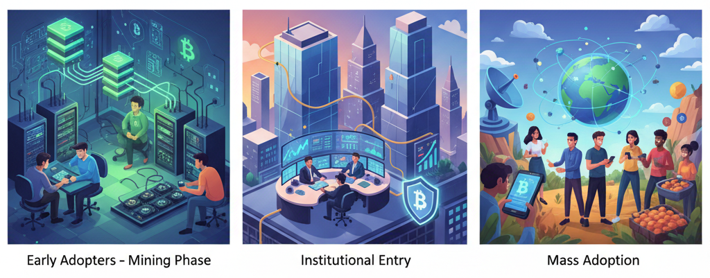 A primeira fase é a era dos mineradores, onde os primeiros a minerar tinham consciência do valor do BTC, e esse grupo alcançou a liberdade financeira muito cedo.