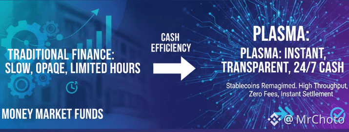From @Plasma 's point of view, the comparison is about cash efficiency rather than just yield. Plasma allows for instantaneous, round-the-clock settlement with complete on-chain transparency, whereas MMFs batch settlements and reconcile balances with delays. Every transfer is definitive and instantly verifiable, eliminating the need to wait for redemptions, NAV ambiguity, and hidden exposure.