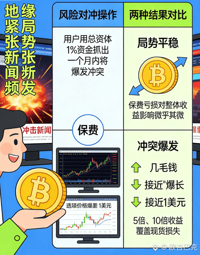 后续会出现两种结果:若局势平稳,比特币价格上涨,这笔小额保费亏损对整体收益影响微乎其微;若冲突真的爆发,比特币现货可能大幅贬值,但此前买入的选项价格会从几毛钱暴涨至接近1美元,轻松实现5倍、10倍收益,足以弥补甚至覆盖现货端的损失,完美抵御黑天鹅风险。