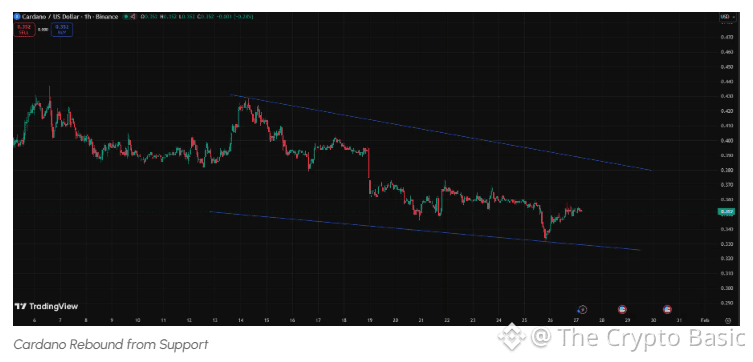 Cardano is suppressed within a channel in the hourly chart, with a recent support rebound keeping hopes of a breakout alive.
