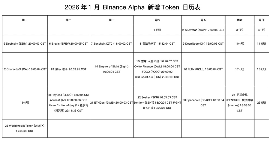 De 2 a 26 de janeiro, a distribuição de novos projetos foi intensa. Abaixo está o calendário detalhado (horário de Pequim CST), mostrando os nomes dos projetos e horários de listagem: