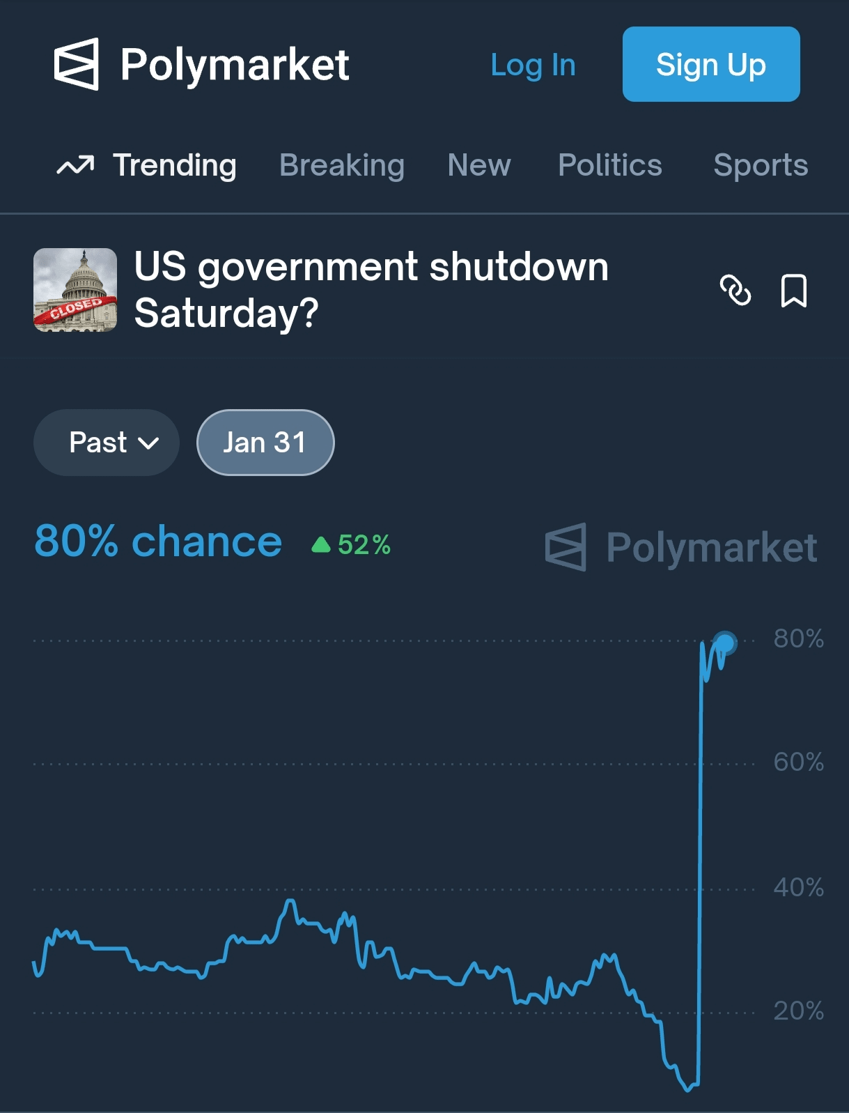 Acabei de ver isso no Polymarket. Eles estão dando 80% de chance de o governo dos EUA fechar neste sábado.