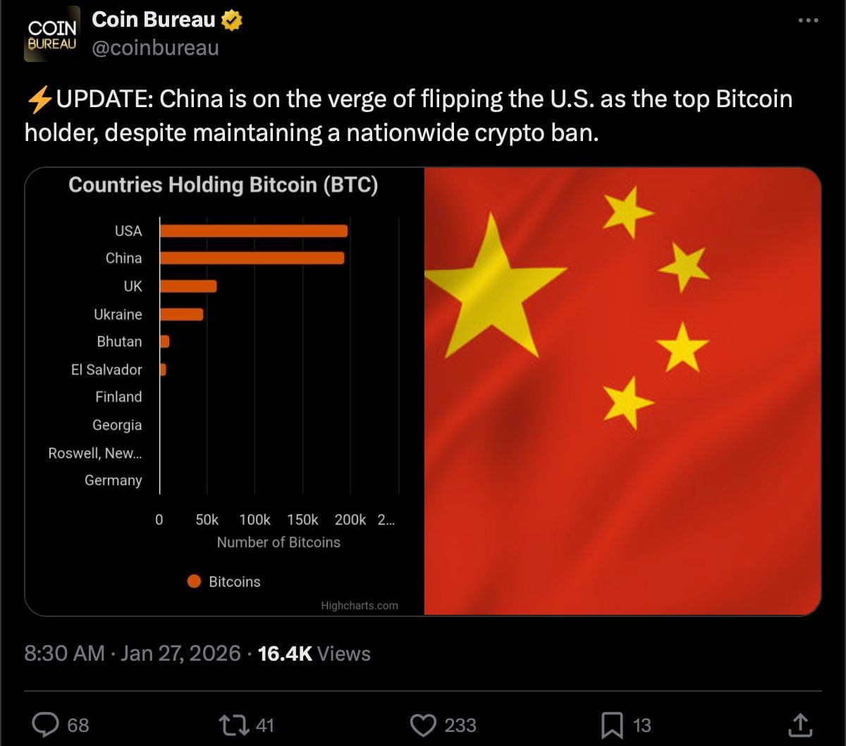 Enquanto Pequim restringiu agressivamente o uso privado de criptomoedas, não liquidou todas as reservas de Bitcoin apreendidas, permitindo que as reservas acumulassem silenciosamente. Isso colocou a China entre os principais detentores governamentais de Bitcoin globalmente — uma posição que parece cada vez mais próxima de ultrapassar os Estados Unidos.
