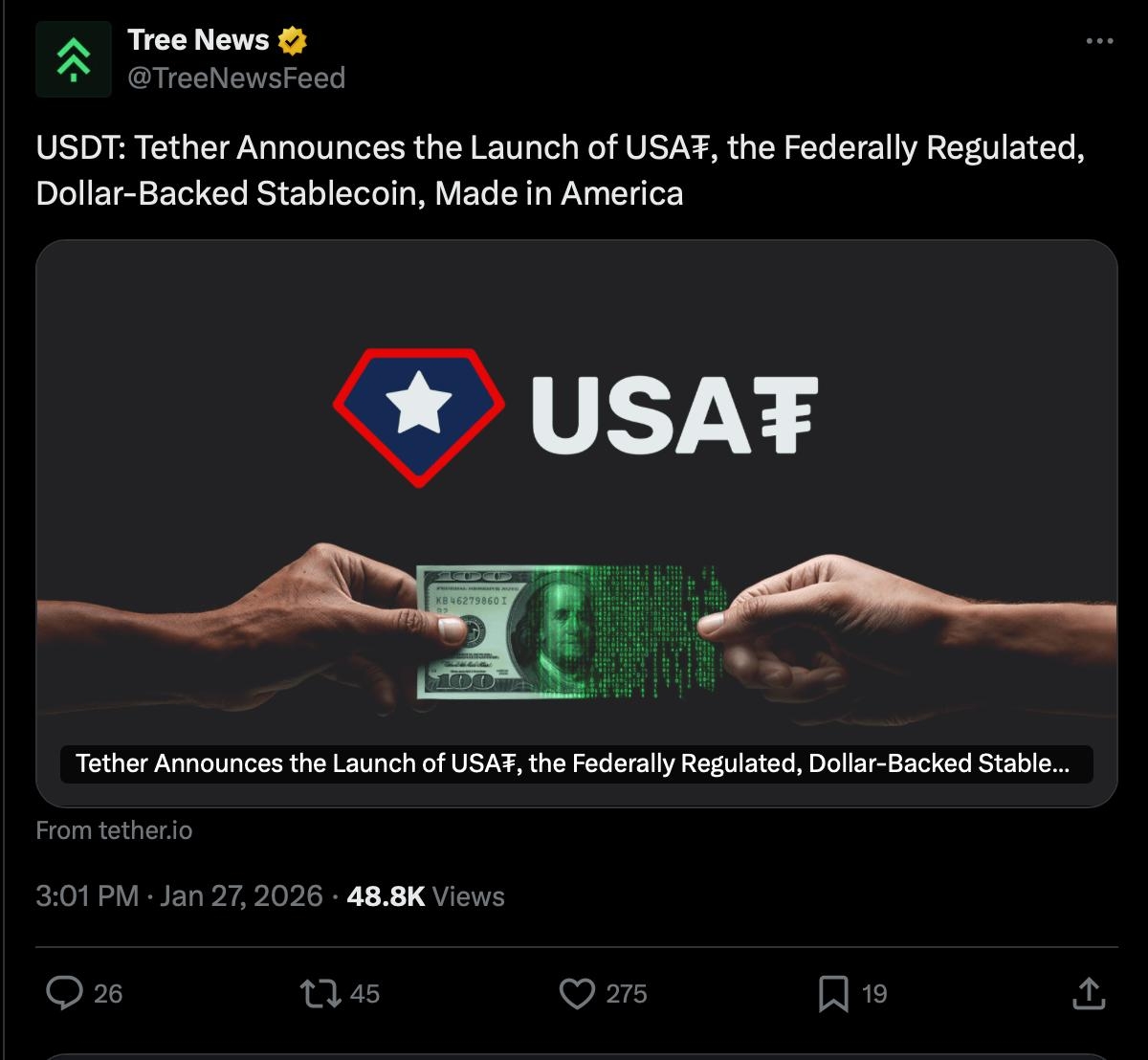 A Tether lançou o USA₮, uma stablecoin em dólar dos EUA regulamentada federalmente