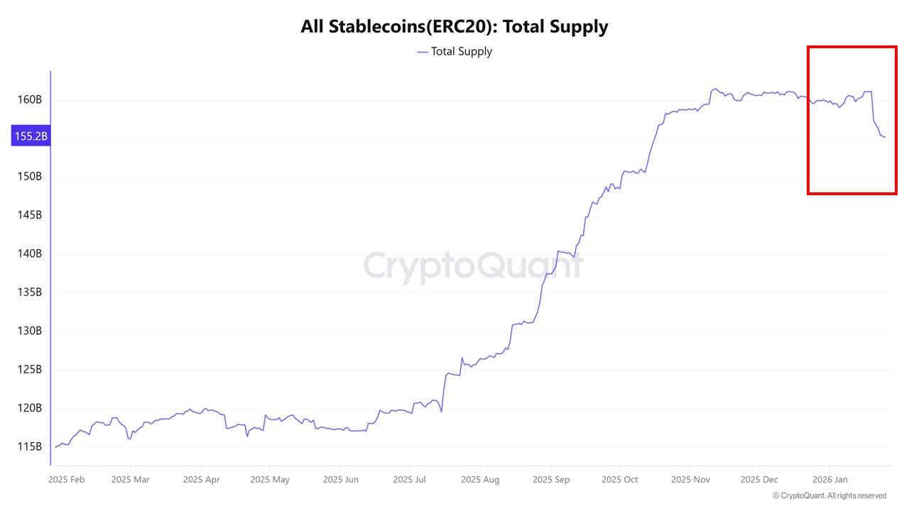 O fornecimento total de stablecoins ERC20 representa o montante de capital atualmente esperando dentro do mercado de criptomoedas. Quando esse fornecimento está se expandindo, geralmente reflete novos fluxos de capital ou uma disposição crescente para assumir riscos, criando condições favoráveis para a recuperação dos preços. Inversamente, um fornecimento em declínio sugere que as stablecoins estão sendo resgatadas ou convertidas de volta em fiat, reduzindo a liquidez geral do mercado. Como essa métrica muitas vezes se move à frente do preço, é útil como um indicador líder para mudanças de tendência de médio prazo.