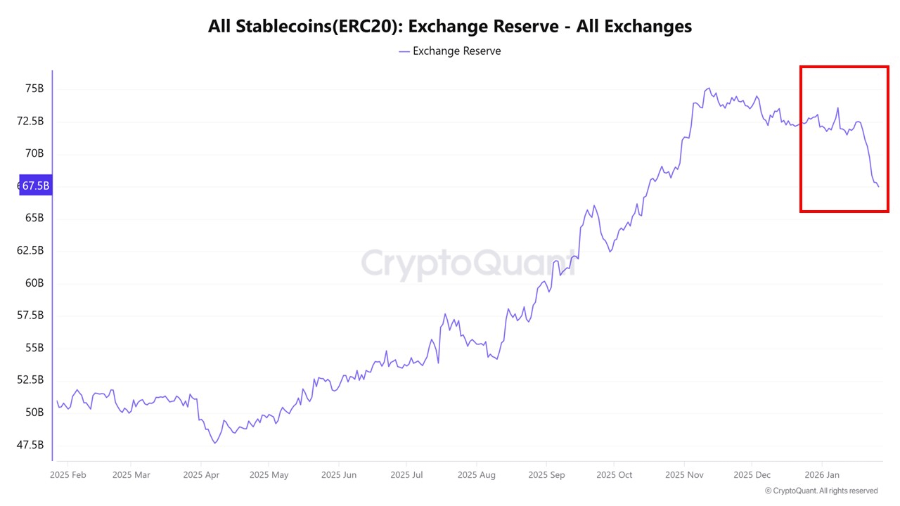 Os saldos de troca de stablecoins ERC20, por outro lado, medem a liquidez imediatamente disponível. Um aumento nos saldos de troca indica que o capital está sendo posicionado para comprar ativos de risco, fortalecendo o potencial de recuperação de curto prazo. Uma queda implica que fundos estão sendo retirados das trocas ou já consumidos, o que tende a enfraquecer a pressão de compra de curto prazo. Quando os saldos de troca caem junto com a oferta total, o sinal indica que o capital está saindo do mercado, em vez de rotacionar internamente.