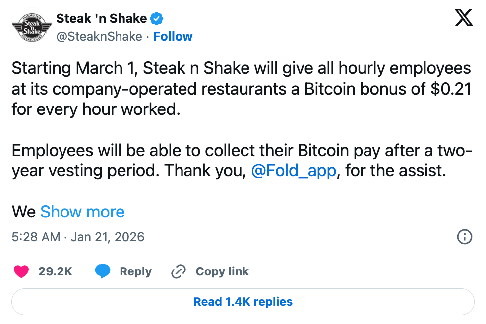 De acordo com um artigo recente publicado pela empresa no X, o Steak 'n Shake começará a distribuir pequenas recompensas em Bitcoin (BTC) para trabalhadores horistas a partir de 1º de março.