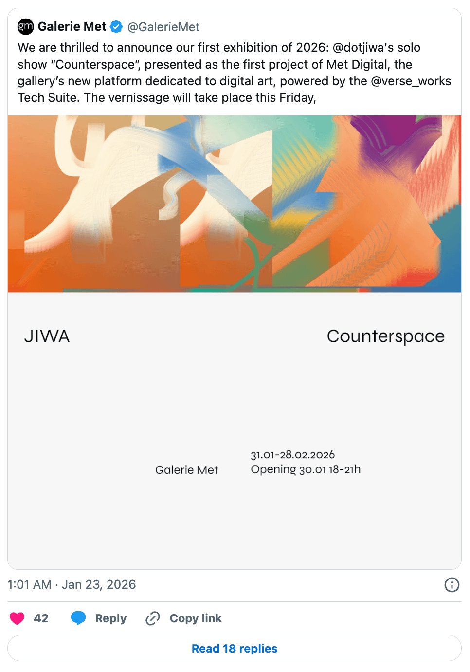 O artista digital Jiwa anunciou que sua exposição individual “Counterspace” será inaugurada em oito dias na Galerie Met em Berlim.