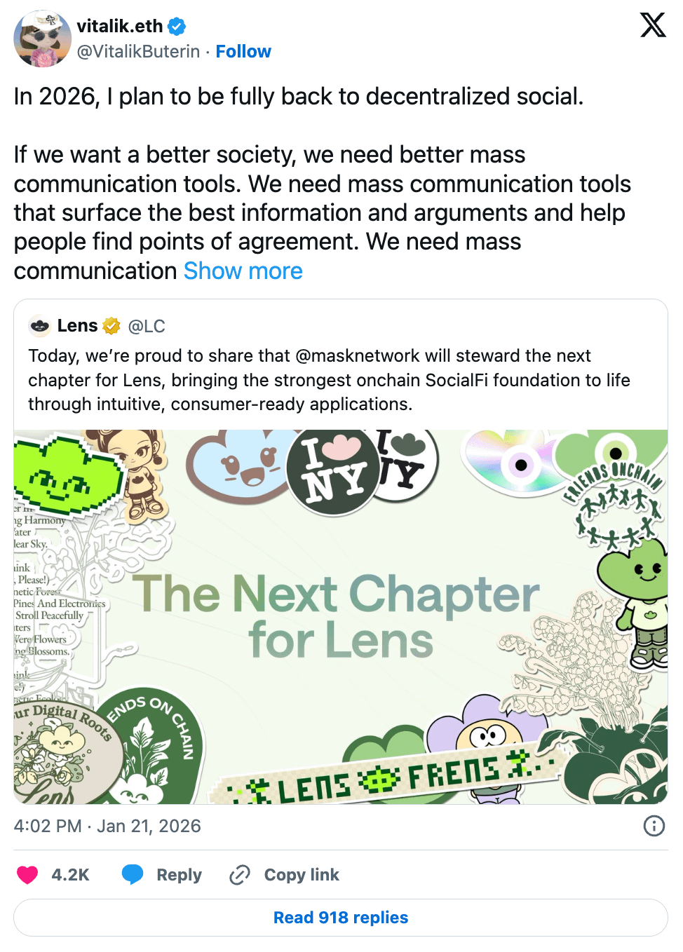 Vitalik Buterin, co-fundador da Ethereum, afirmou que as redes sociais descentralizadas serão sua principal tarefa em 2026. Em uma postagem no X, ele destacou que plataformas sociais construídas sobre um banco de dados público compartilhado podem apoiar comunicações online mais saudáveis.