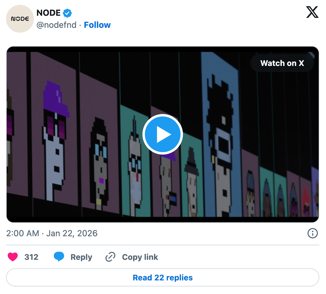 A nova fundação artística sem fins lucrativos NODE, localizada em Palo Alto, realizará uma exposição de 10.000 de 23 a 25 de janeiro de 2026, que será a primeira exposição de arte totalmente dedicada aos CryptoPunks, que são obras de retrato em pixels criadas por Matt Hall e John Watkinson da Larva Labs em 2017.