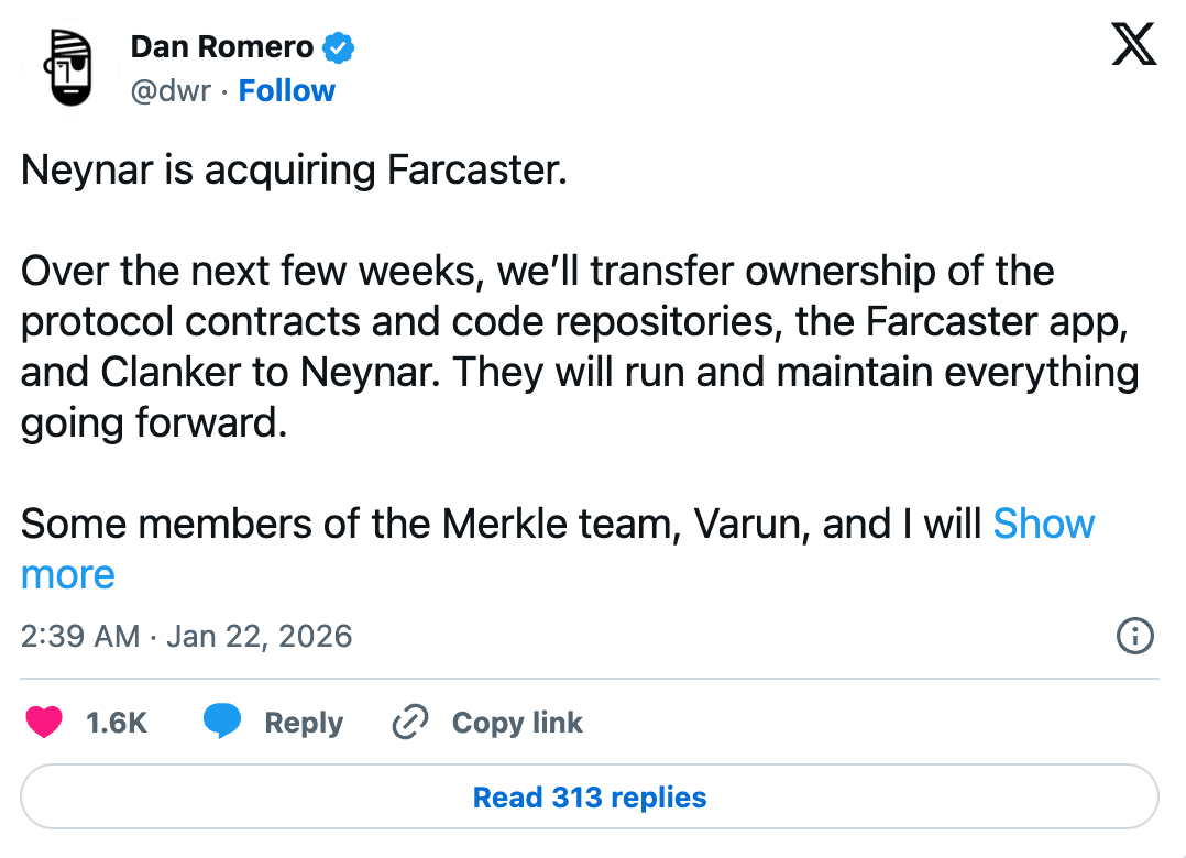 Cinco anos depois, Neynar assumiu a operação do Farcaster.