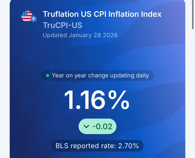 A leitura mais recente do CPI da Truflation dos EUA mostra a inflação em 1,16%, um nível que está bem abaixo da meta de 2% declarada pelo Federal Reserve. Esta não é uma pequena variação. É uma mudança estrutural que desafia diretamente a posição atual de política do Fed e coloca Jerome Powell em um corredor de escolhas cada vez mais estreito.