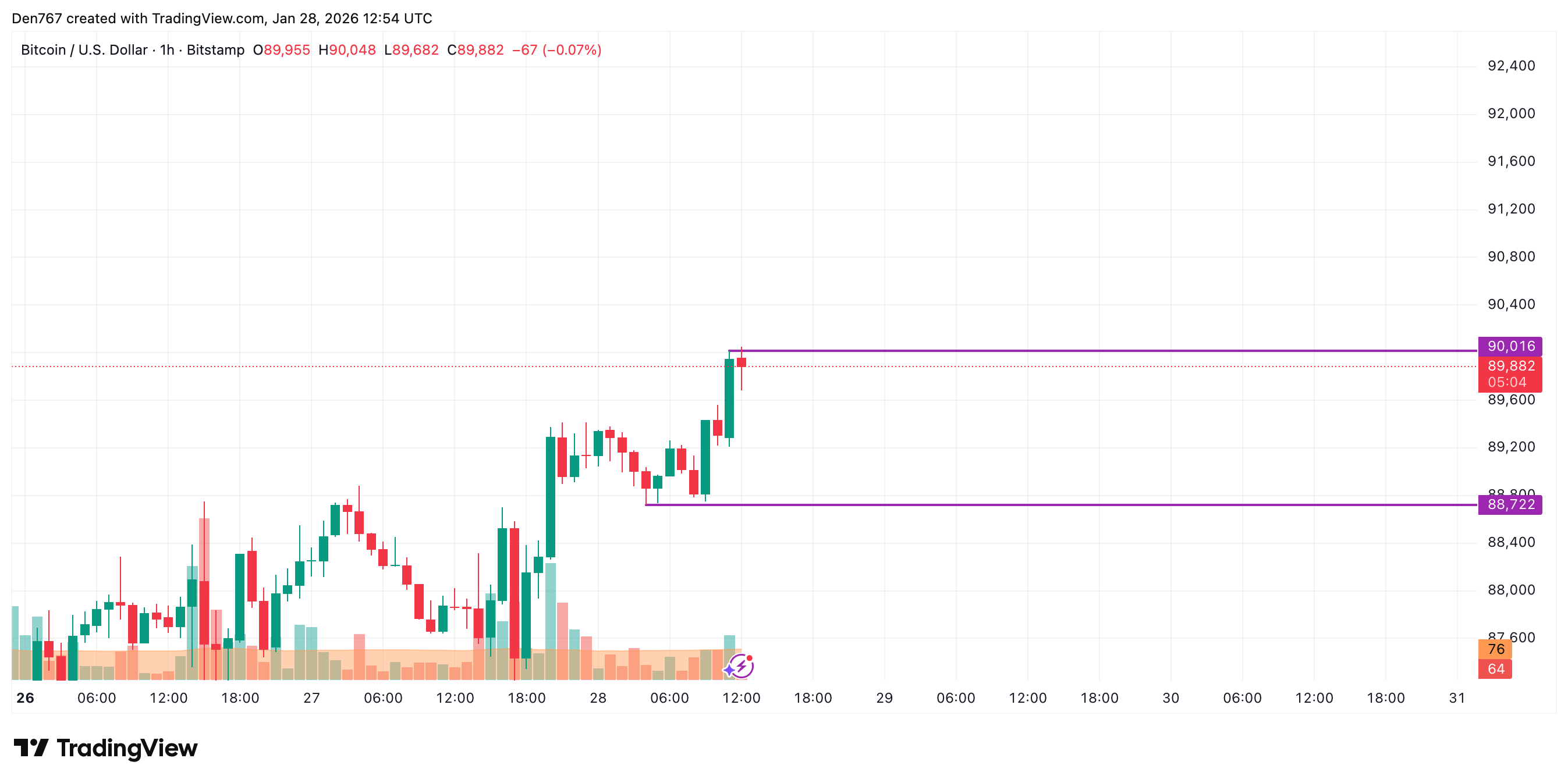No gráfico horário, o preço do BTC está próximo da resistência local em $90,016. Se romper, a alta provavelmente continuará na zona de $91,000. O volume aumentou, o que significa que há grandes chances de ver um movimento ascendente adicional.