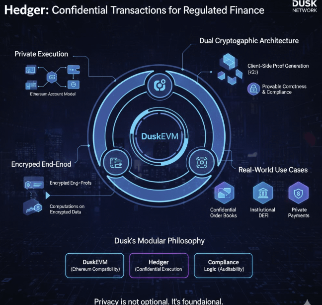 O Hedger também reflete a filosofia mais ampla do Dusk em torno da modularidade. A privacidade não é esperada para resolver liquidação, conformidade ou desempenho por si só. É um componente em um sistema onde cada camada faz seu trabalho de maneira limpa. O DuskEVM fornece compatibilidade com Ethereum. O Hedger fornece execução confidencial. A lógica de conformidade pode coexistir sem ser minada. Essa separação é o que permite que o sistema escale sem se tornar frágil.