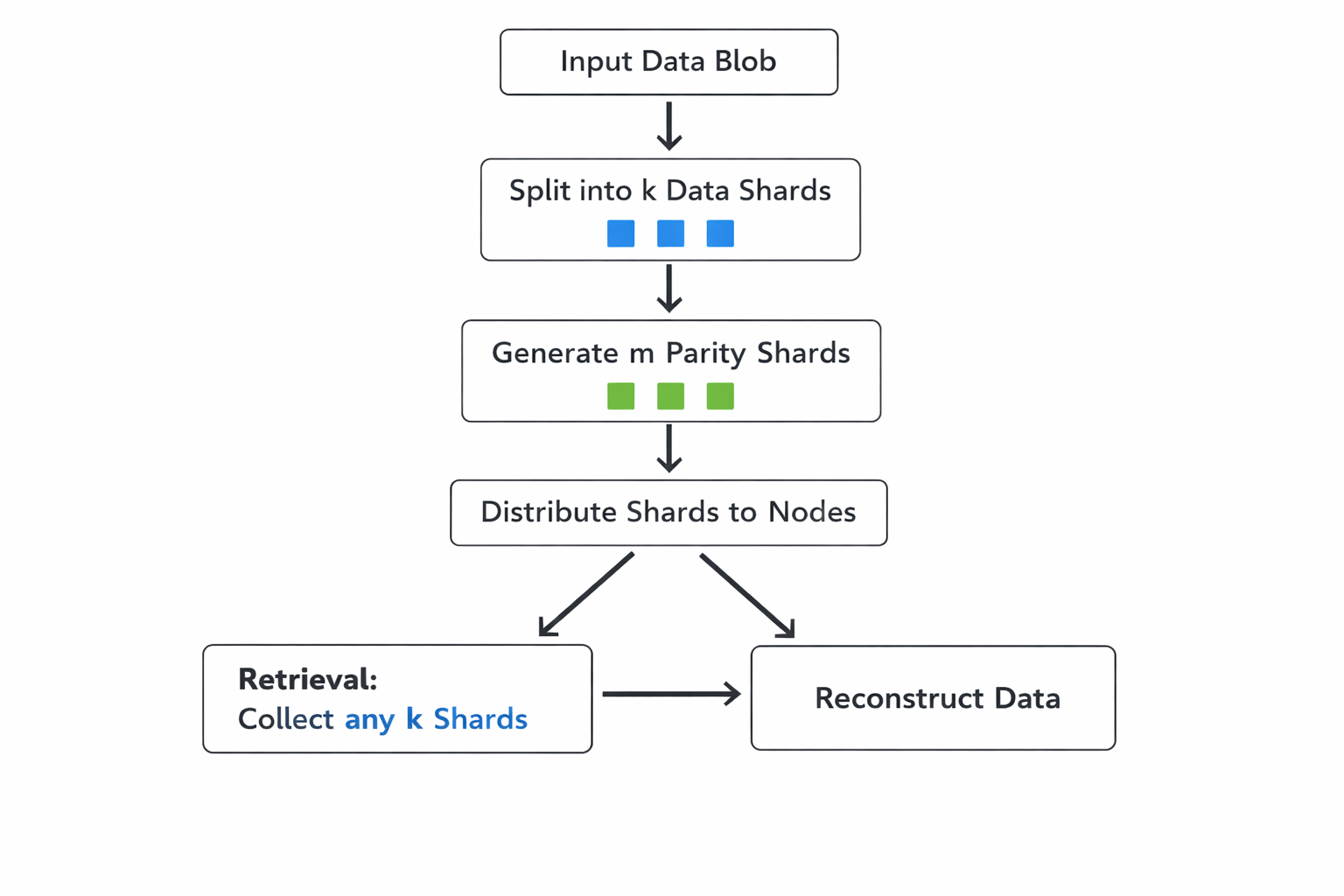 Vamos detalhar um pouco essa codificação de apagamento. Você insere um blob de dados. Walrus o divide em k fragmentos de dados e m fragmentos de paridade. No total, você tem k + m fragmentos, que são armazenados em diferentes nós. Para recuperar seus dados, você só precisa de qualquer k desses fragmentos, e alguma matemática inteligente coloca tudo de volta junto. Isso usa menos armazenamento e largura de banda do que apenas fazer muitas cópias de seus dados, então é perfeito para lidar com os enormes conjuntos de dados necessários para o treinamento de IA.