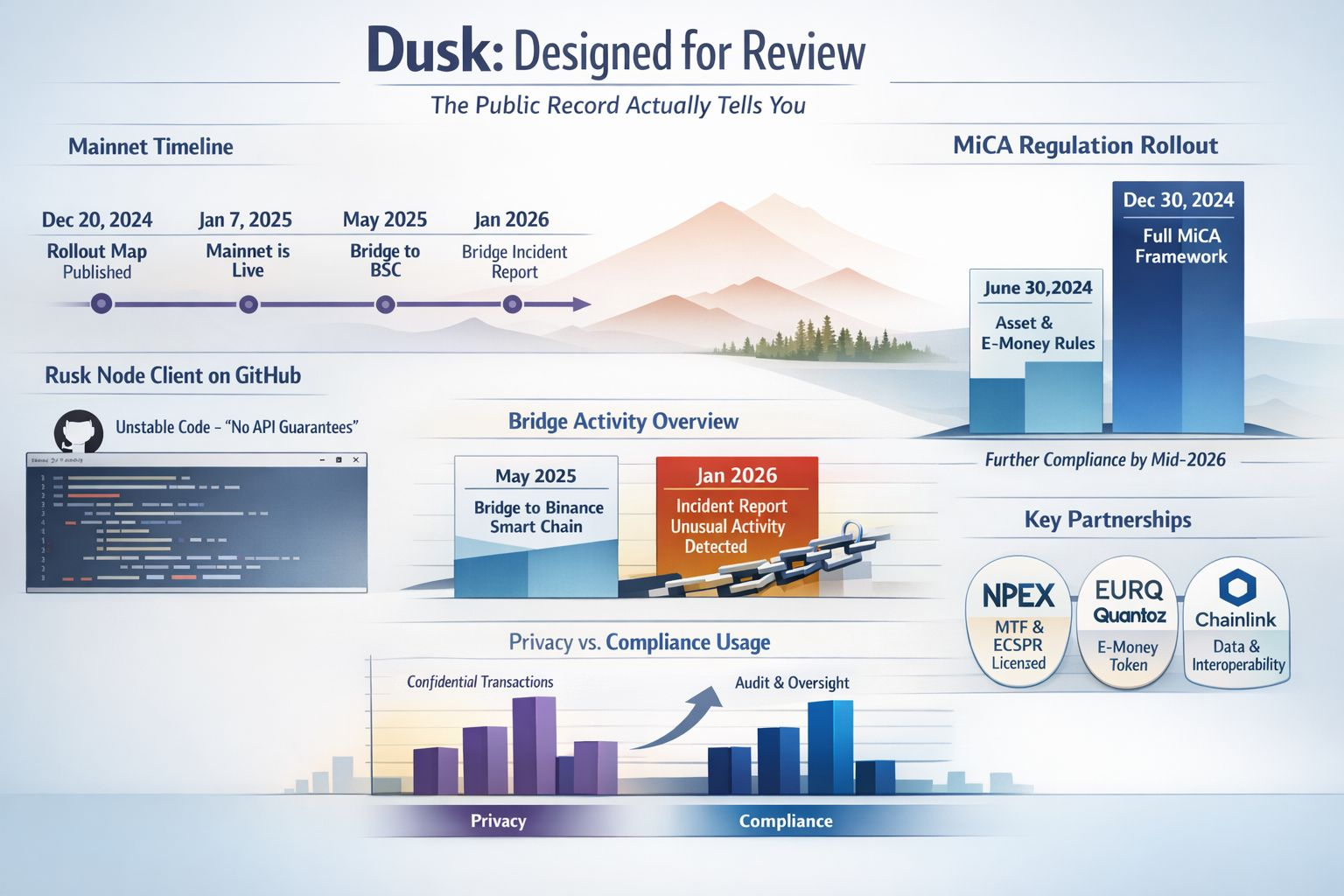 Nada disso garante o futuro da Dusk. O registro público não pode fazer isso. O que ele pode fazer é restringir o argumento a coisas que você pode verificar: datas de lançamento que coincidem entre postagens, repositórios de software que existem, relatórios de incidentes que foram publicados, contrapartes que afirmam seu status de licenciamento em público. Em um mercado que ama histórias organizadas, essa é a forma mais durável de confiança: não crença, mas evidência que você pode revisitar.