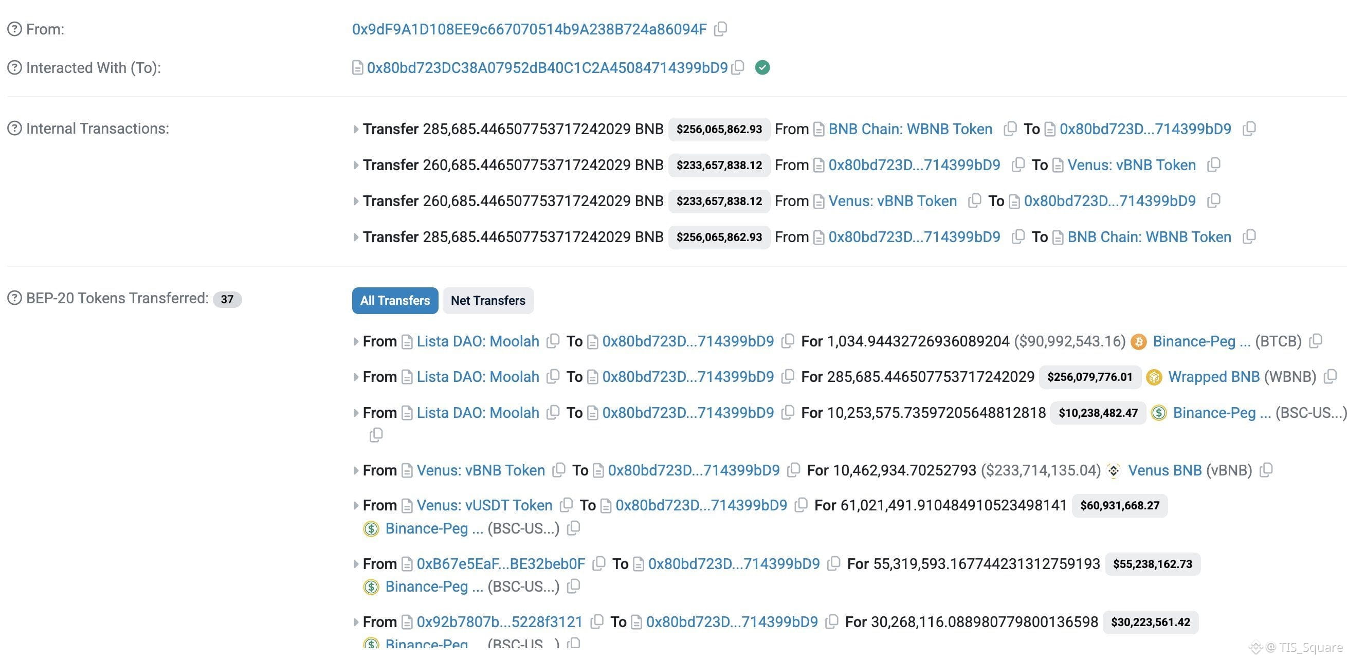 Cụ thể, chúng đã vay tới 285,685 W$BNB trị giá hơn 256 triệu USD, cùng hàng triệu USD giá trị BTCB và USDT.