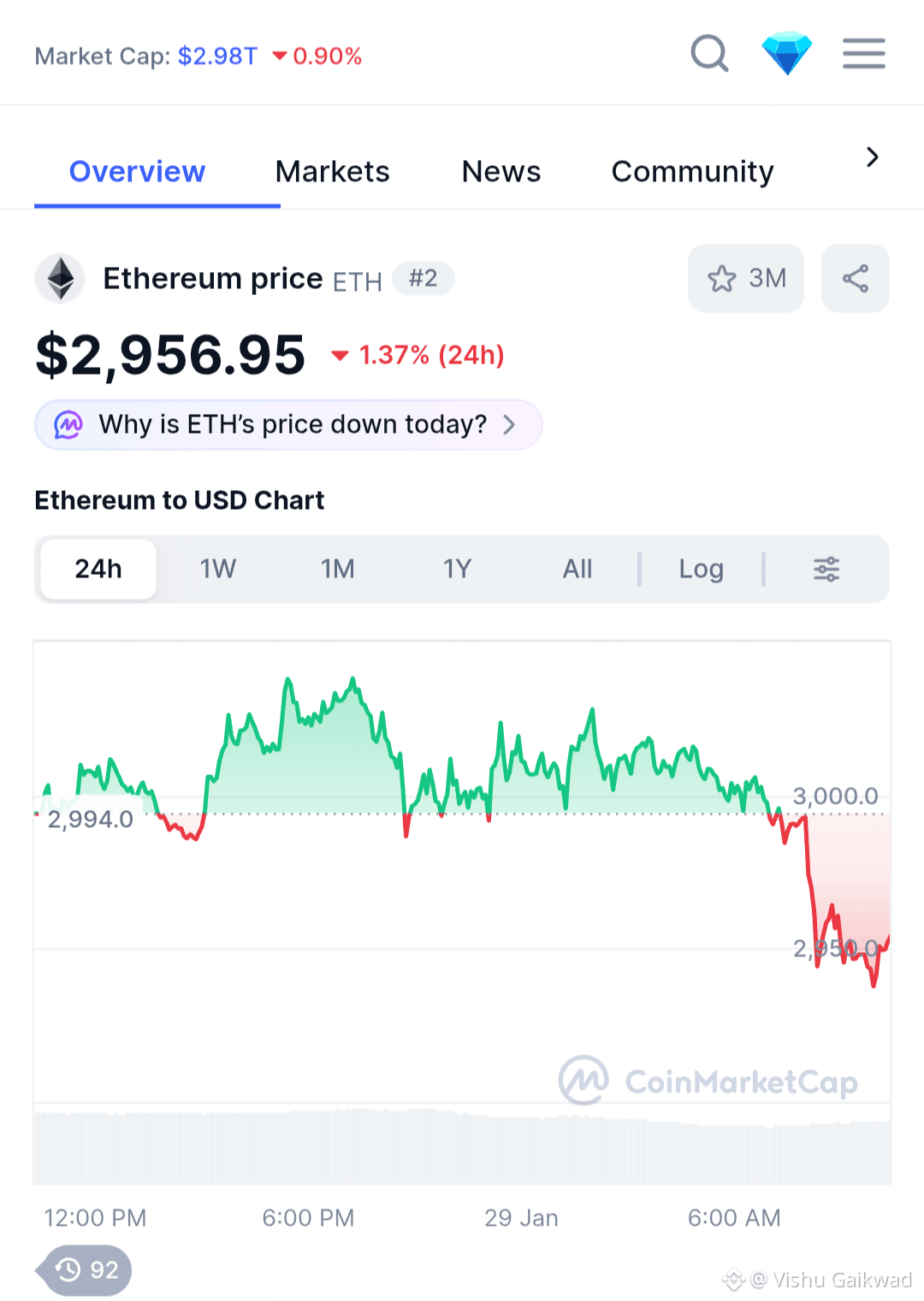 As of January 29, 2026, Ethereum (ETH) is trading around $2,945–$3,040 USD. The market is experiencing volatility due to recent heavy liquidations and macroeconomic factors, with a 24-hour range of approximately $2,934–$3,040. ETH is showing a slight 24h, 1-month increase, yet is down over 6 months.