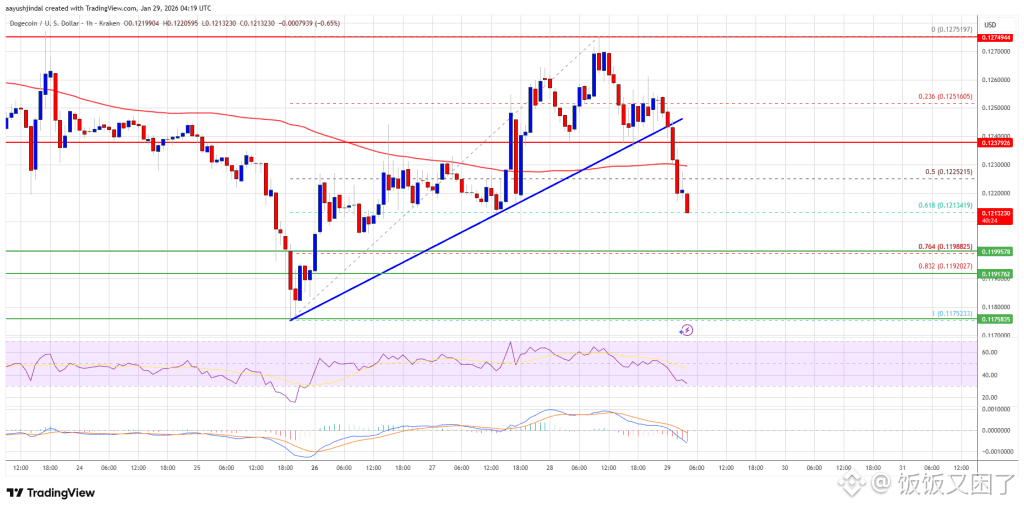 从技术面来看,#DOGE 从 0.1275 美元高点开始新一轮回调,目前价格低于 0.1225 美元,并且跌破了 100 小时简单移动平均线。小时图显示,价格已经跌破了支撑位在 0.1245 美元的上升趋势线,这对多头来说是个警示信号。