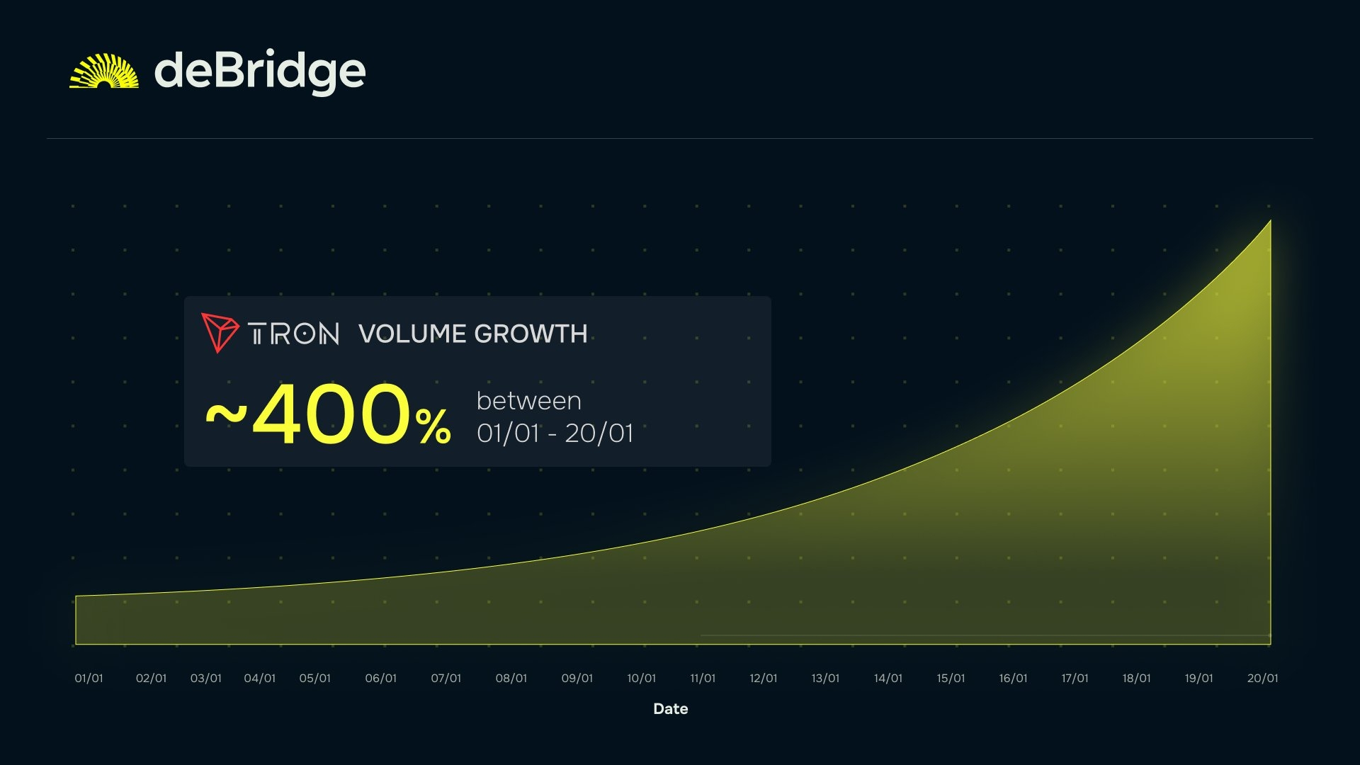 Em apenas 20 dias (1-20 de janeiro), o volume de ponte direcionado para a TRON via deBridge explodiu em mais de 400%, como mostrado claramente no gráfico. Isso não é um pico de um dia só ou uma anomalia de curta duração, é uma aceleração sustentada que conta uma história muito maior sobre onde os usuários e a liquidez estão optando por se estabelecer.