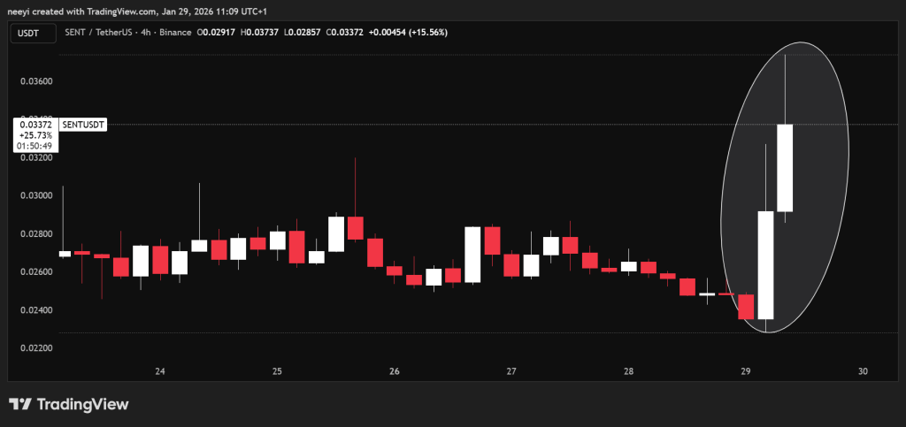 O preço do Sentient (SENT) chamou a atenção hoje após um movimento acentuado para cima que se destacou em um mercado mais amplo instável. O preço do Sentient subiu aproximadamente 50% a partir de uma baixa inicial próxima a $0.024, interrompendo uma curta sequência de pressão para baixo que havia se acumulado nas sessões recentes. O momento chegou de repente, o que naturalmente levantou questões sobre o que mudou e por que os compradores entraram com convicção.
