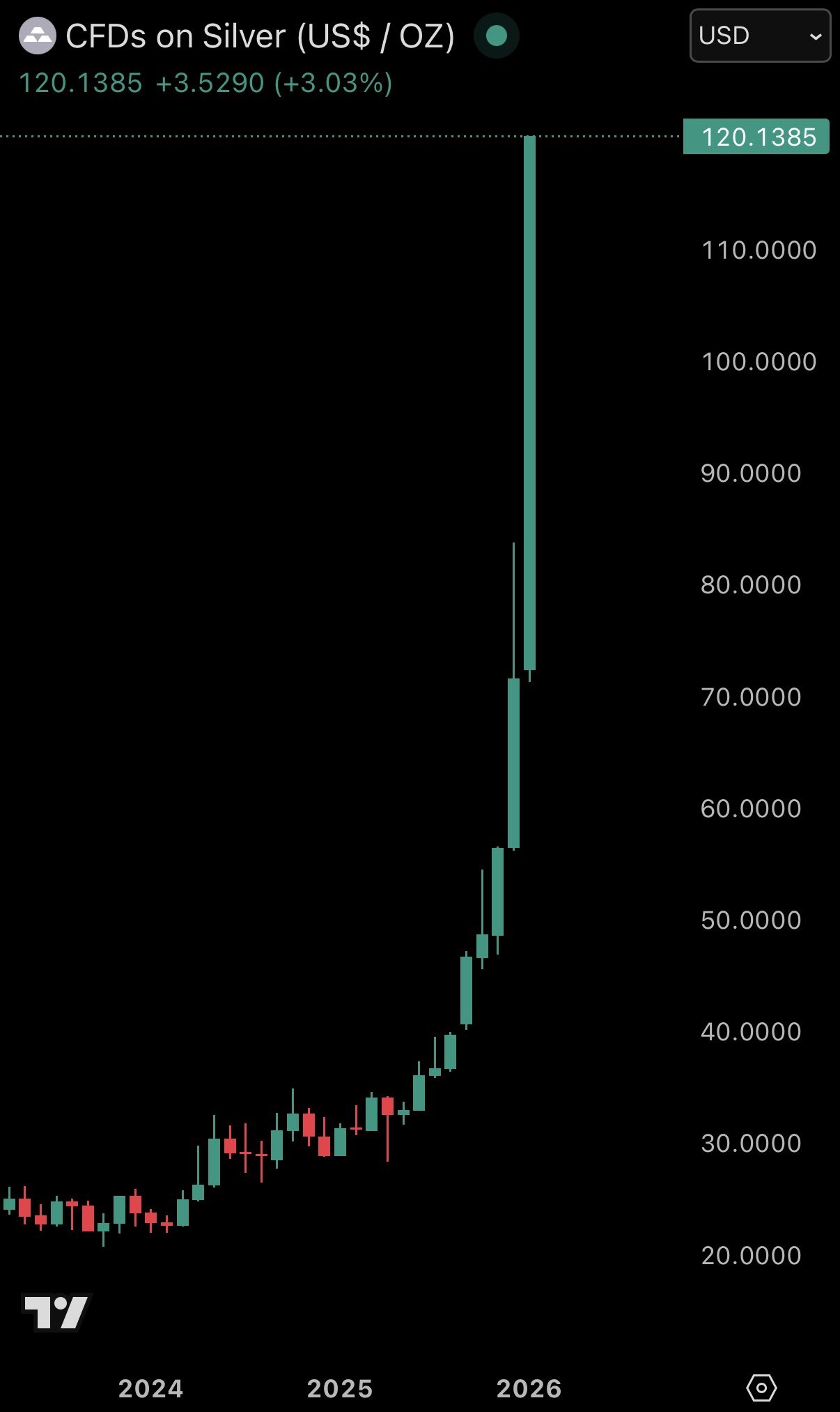 $XAG O preço da prata atingiu $120,07 nos futuros da Comex na quinta-feira, subindo mais de 3% naquele dia, enquanto os preços na Índia ultrapassaram Rs 410.000 por quilograma pela primeira vez. O aumento está ligado à demanda industrial crescente por painéis solares, veículos elétricos e centros de dados de IA em meio a escassez de suprimentos, além da compra de refúgio impulsionada pelo medo da inflação e geopolítica. O ouro se aproxima de $5.600 por onça e o cobre ultrapassa $6,30 por libra no aumento mais amplo das commodities, embora alguns analistas avisem sobre possíveis recuos devido à liquidez baixa.