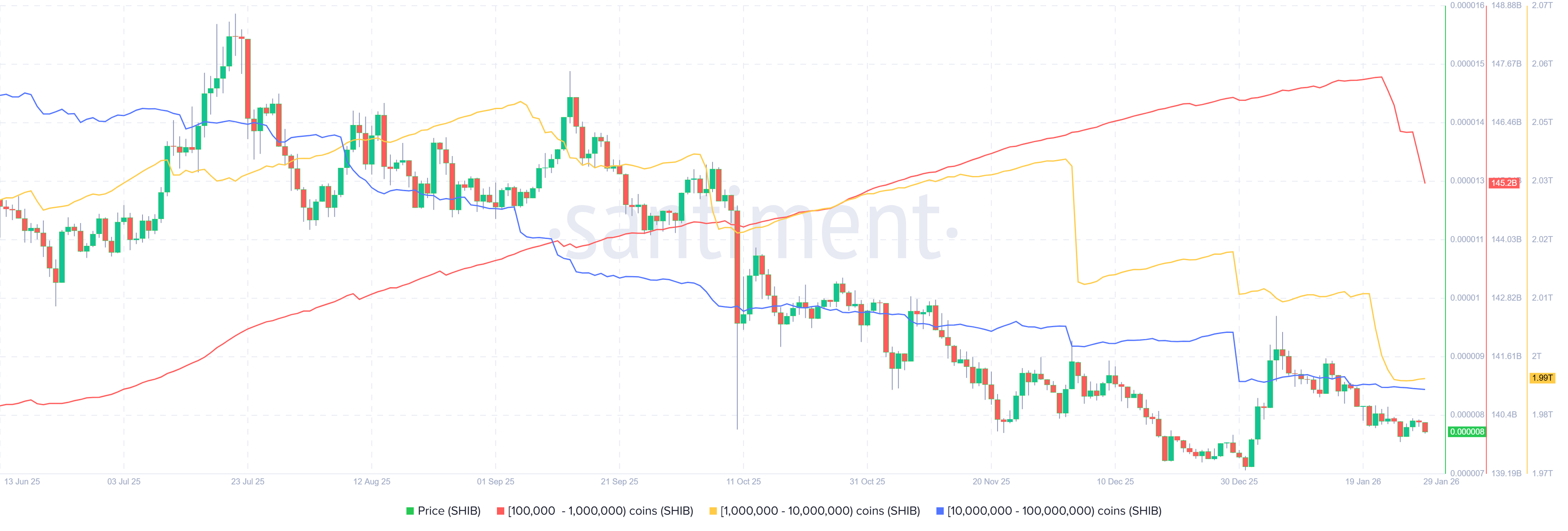 O indicador métrico indica que as baleias que possuem entre 100.000 e 1 milhão (linha vermelha), 1 milhão e 10 milhões (linha amarela) e 10 milhões e 100 milhões (linha azul) despejaram um total de 32,17 bilhões de tokens SHIB de 20 de janeiro até quinta-feira, aumentando assim a pressão de venda.