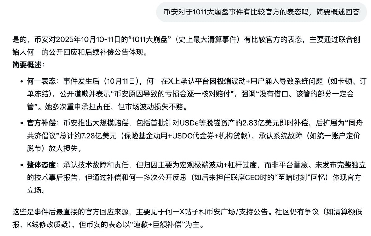 Primeiro, sendo realista, a Binance realmente cometeu erros durante o incidente de 1011 e precisa assumir a responsabilidade. Como resumido por Grok, He Yi @heyibinance também se manifestou publicamente, reconhecendo que o sistema da Binance realmente teve problemas de lentidão, impossibilitando a realização de ordens e a desvalorização do USDe, e foi feita uma certa compensação, mas a principal controvérsia da comunidade é que o valor da compensação não foi suficiente.