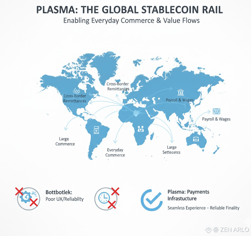 Plasma That focus matters because stablecoins are already behaving like the rails for cross border value. The bottleneck is not demand, it is the experience and the reliability. Plasma is basically saying if stablecoins are going to carry everyday commerce, remittances, payroll, and large settlement flows, the base layer needs to feel like payments infrastructure, not a developer demo.