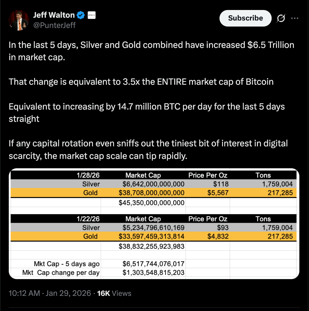 O Bitcoin só precisa de uma participação modesta da demanda estilo ouro para rotacionar em BTC, de acordo com Jeff Walton, diretor de risco da Strive, uma empresa de tesouraria de BTC.