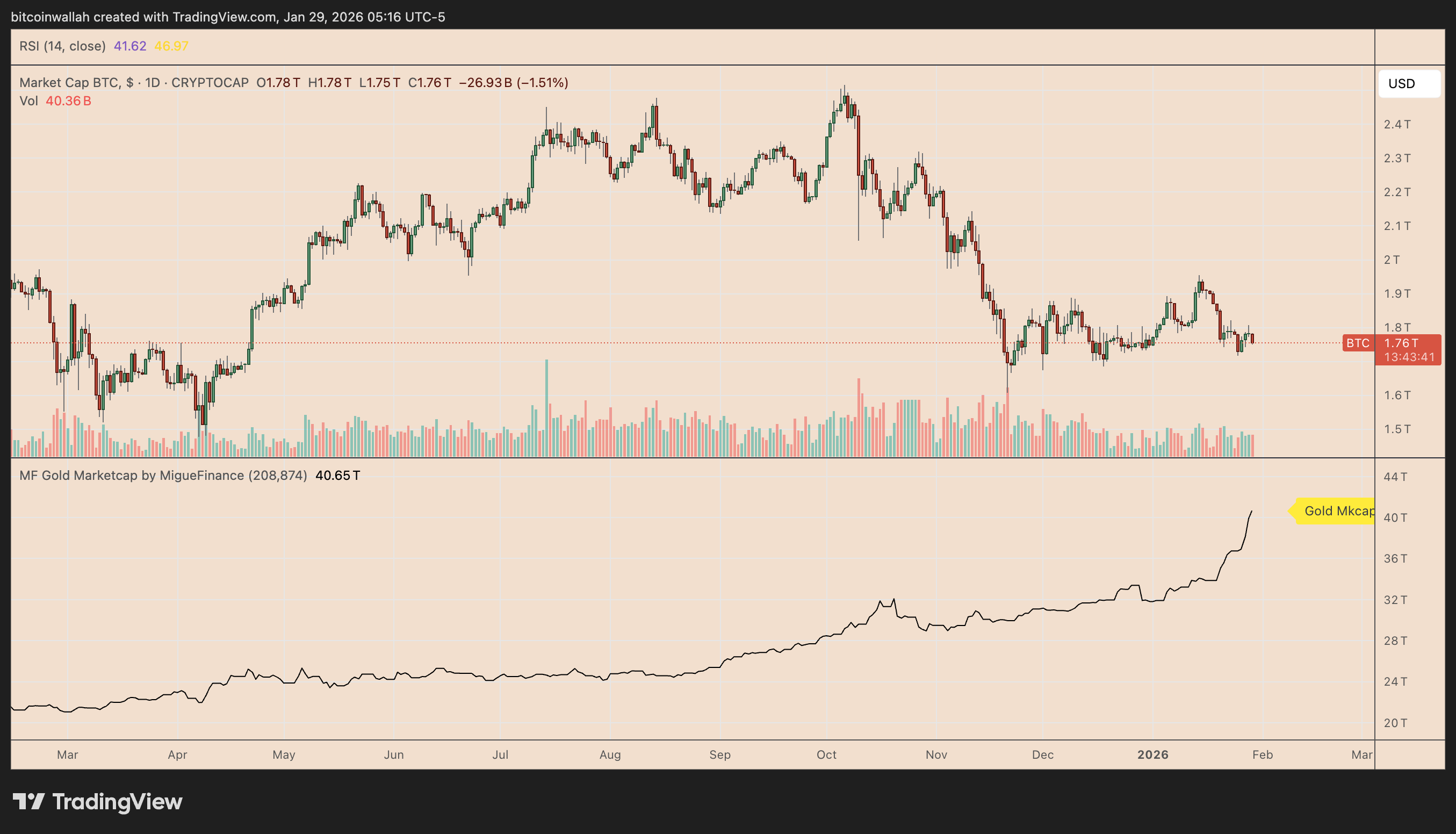 Em janeiro, o valor do Bitcoin era de apenas cerca de 4,30% da capitalização de mercado do ouro de $41,69 trilhões.