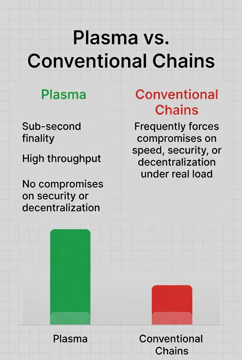 O segundo coloca números na vantagem, comparando a finalização em sub segundo do Plasma e alto throughput contra cadeias convencionais que frequentemente forçam compromissos em velocidade, segurança ou descentralização sob carga real.