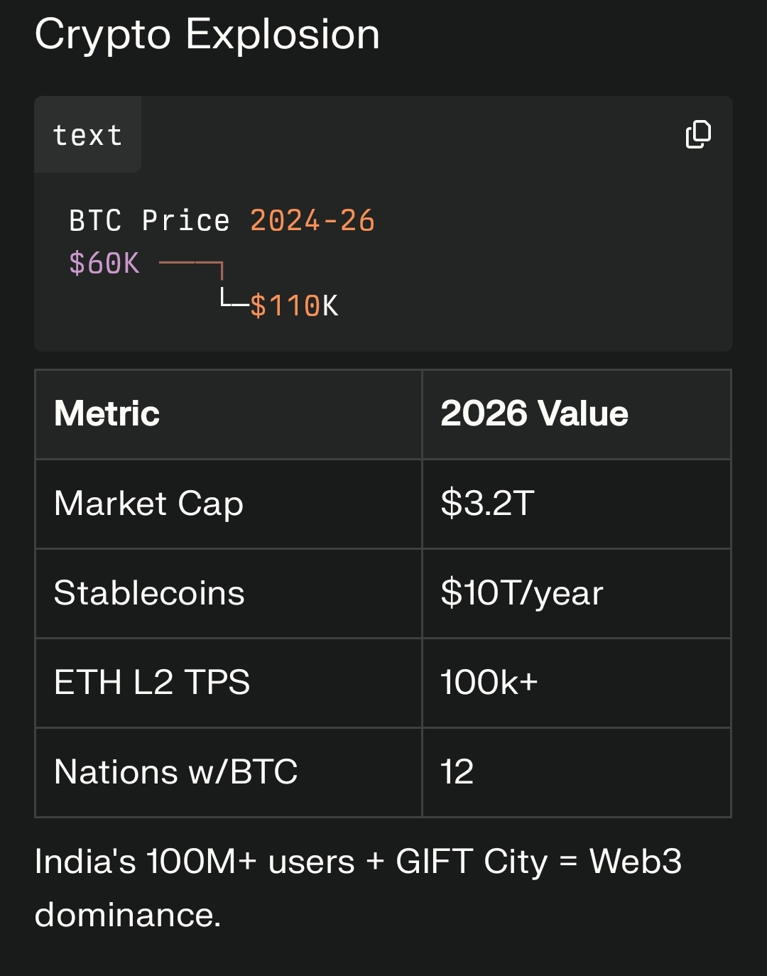 Liderança da ÍndiaMembro do BRICS + clareza sobre impostos para criptomoedasCidade GIFT: ativos Web3 de mais de $50 bilhõesUPI x blockchain = remessas globaisAja agora: Nações diversificam, indivíduos acumulam BTC/ETH, Índia acelera a Cidade GIFT.