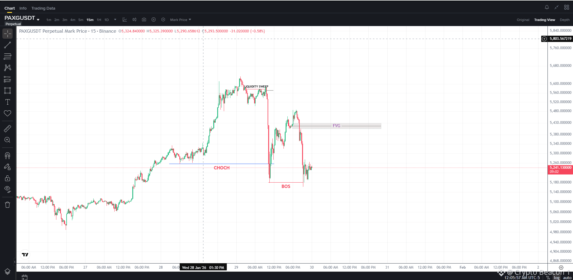 We can see that the price of PAXG pair has dropped along with the entire crypto market. We can see on the chart as mentioned that the liquidity has been sweep . And there was a Change of Character on price from Bullish to Bearish with continuation of bearish by Break of structure on price . So we can go long on a bearish setup. I have marked a bearish FVG , from where you can go short on PAXG pair.