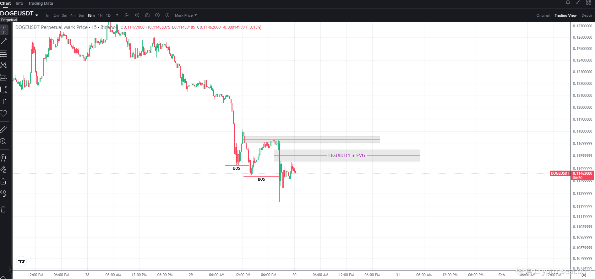 As we can see on the chart , that price is creating lower lows or the price is bearish as the whole crypto market is bearish. So we will not get against the river tide. I can see that the price of doge will be moving side ways for few hours to generate liquidity. But eventually it will drop. Because we can see that there is break of structure on price for bearish. So going Long will be a full wrong decision. We can also see on the chart that there is a FVG as I marked on the chart down below that there is a short term swing high + FVG. So there is a high possibilities of price going into that FVG with grabbing the liquidity and then eventually will fall. So we can enter into the market from that.